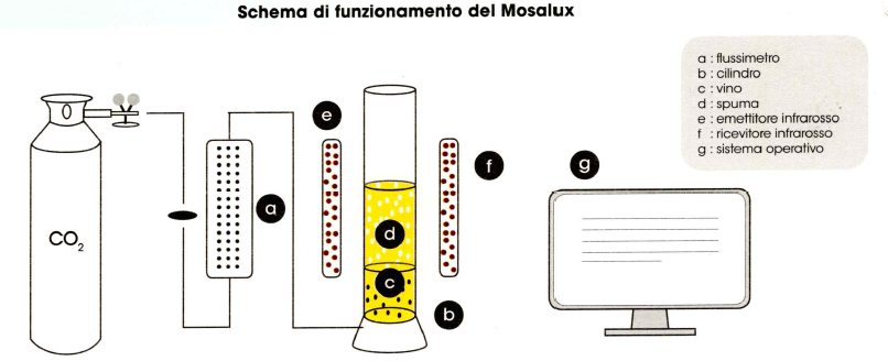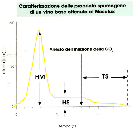 Un’analisi al Moselux è contraddistinta da: HM, ovvero l’altezza massima raggiungibile dell’effervescenza, che fornisce un dato sulla quantità di spuma prodotta nel calice al momento della mescita, HS definito come l’altezza a stabilizzazione della spuma che da indicazione sull’effervescenza generata dai “cordoni” di bollicine. Altro parametro fondamentale è TS ovvero il Tempo di Stabilità che fornisce informazioni riguardanti la persistenza della spuma sulla superfice del vino. Una buona spumabilità è caratterizzata da un’altezza massima (HM) superiore a 20mm e da un tempo di stabilità della spuma (TS) superiore a 20S. Questo strumento ci permette di studiare le sostanze responsabili o inibitrici della spuma e permette di prevedere le capacità spumo gene dei vini base. L’enologo quindi possiede dunque uno strumento supplementare per selezionare i vini che andranno a comporre l’assemblaggio finale.